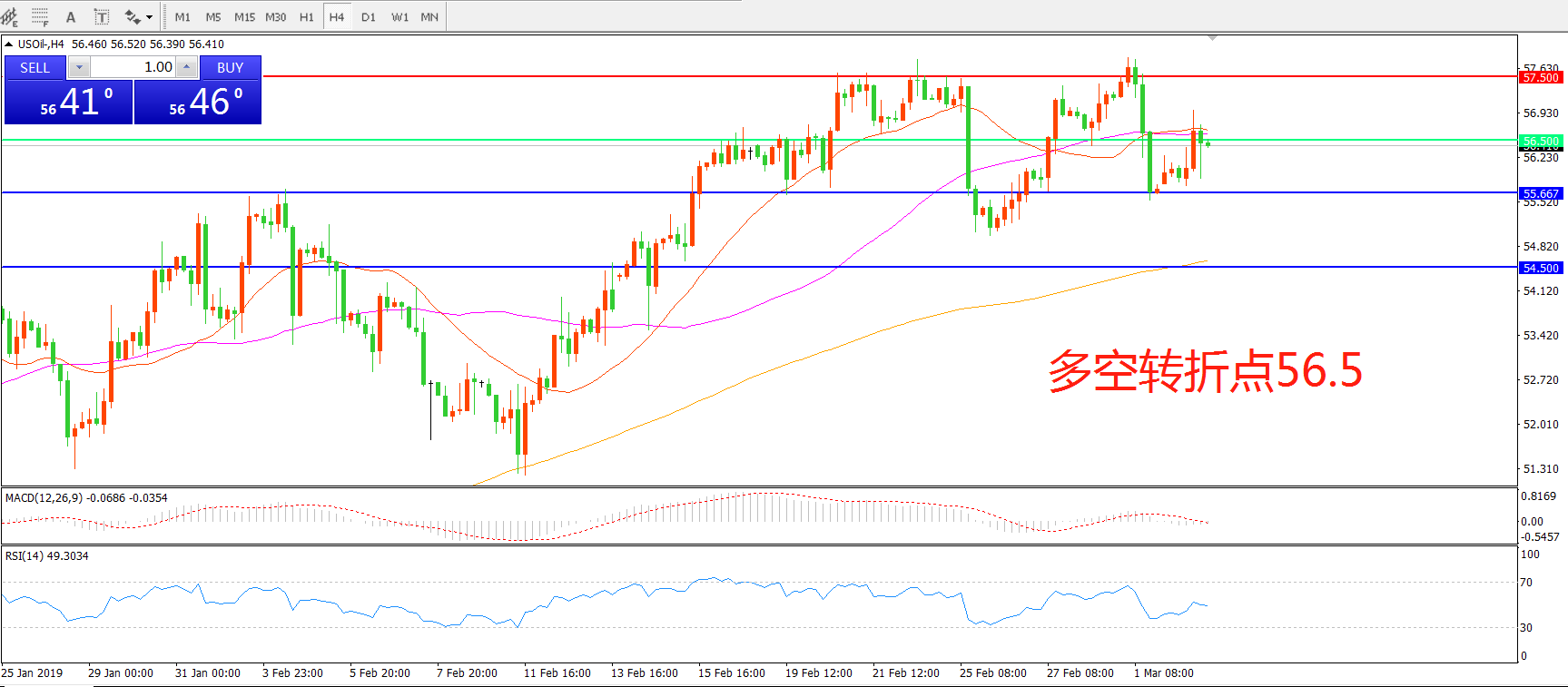 交易策略:在56.50之下看跌,目标55.50    54.50