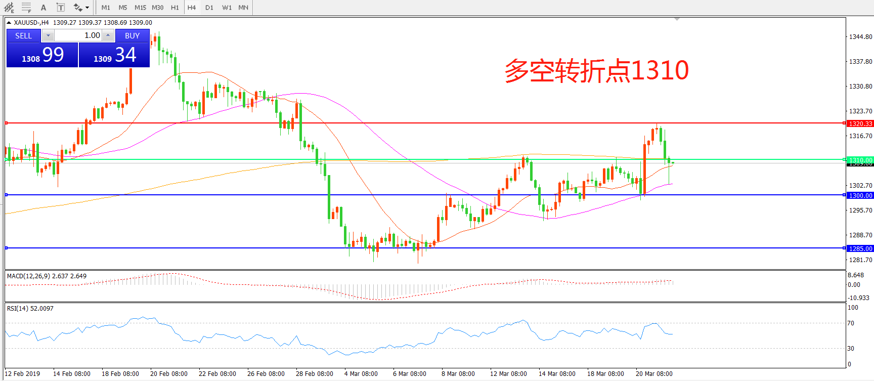 交易策略:在1310.00之上看涨,目标1320.00  1330.00