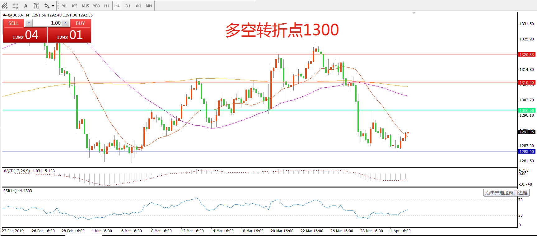 现货黄金周二(4月2日)震荡盘整,美市盘中最高上测至1291.82美元/盎司,暂时重回1290关口略微上方,走势依然较为疲软。另一方面,美元延续反弹态势,日内最高升至97.50,为3月8日以来的最高水平。美国最新公布的耐用品订单录得下滑,不过这并未影响到美元多头的兴致。英国首相特雷莎•梅将与内阁举行长达五小时的危机会谈,试图打破眼下的脱欧僵局。今晚将迎来有”小非农”之称的ADP就业数据公布,市场目前预期增加17万人,重点关注。