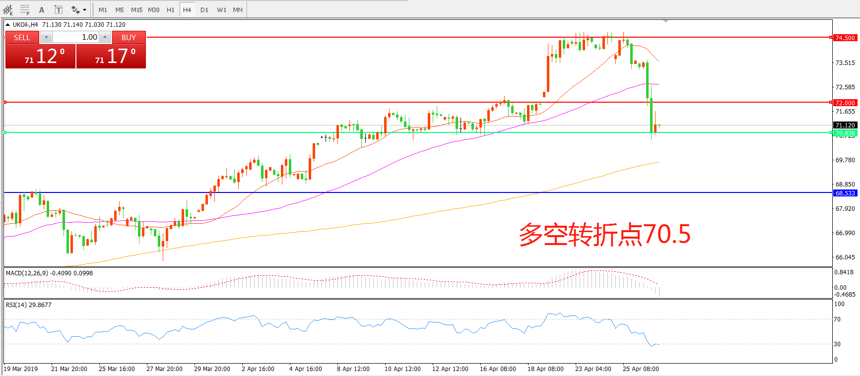 4小时图看,油价连续下行,跌破21、55均线两道关口,整体走势偏弱,但200均线逐渐上移,有可能形成支撑,MACD红柱减少,绿柱增加,RSI指标拐走平,日内重点关注70.5一线支撑。