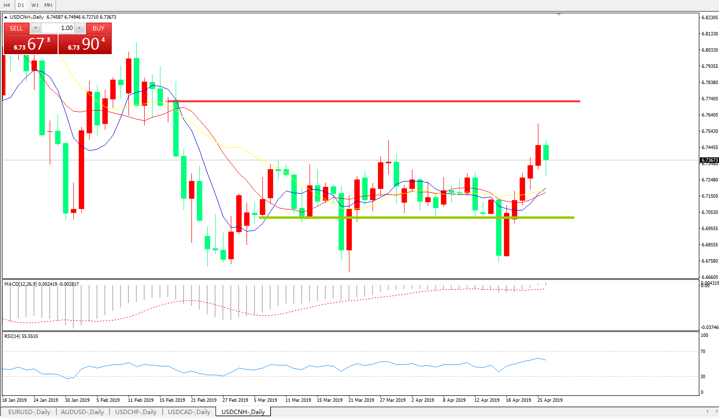 交易策略: 在6.6990之上,看涨,目标价位为6.7845,然后为6.8185。