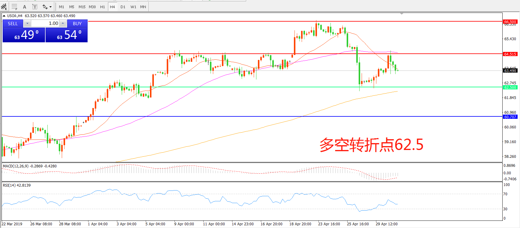 4小时图看,油价冲击64.5阻力后震荡下行,显示55均线附近阻力较强, 200均线逐渐上移,日内振幅预计逐渐收窄,MACD绿柱减少, RSI指标拐头向上,日内重点关注EIA库存数据,如数据利多,油价可能迎来反弹。