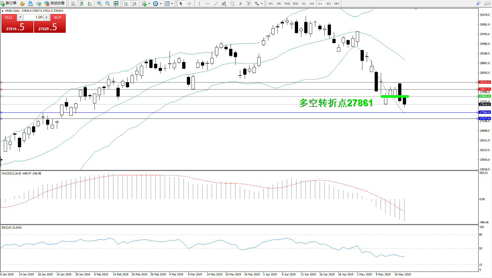 香港恒生指数平开后震荡走低,跌0.57%,报27787.60点。贸易战不断升温以及人民币贬值持续令市场承压,加上盘中A股重挫回调拖累港股倒跌,尾盘恒指跌幅加大。现外围美股收跌令港股承压,市场担忧两国贸易关系恶化给企业带来冲击,港股做多动力匮乏,外围转趋恶劣,坏消息一重接一重。当中以5G 概念及手机设备制造等板块跌幅较大,多只股份更齐创出月内低位。贸易战升温引投资者忧虑。
