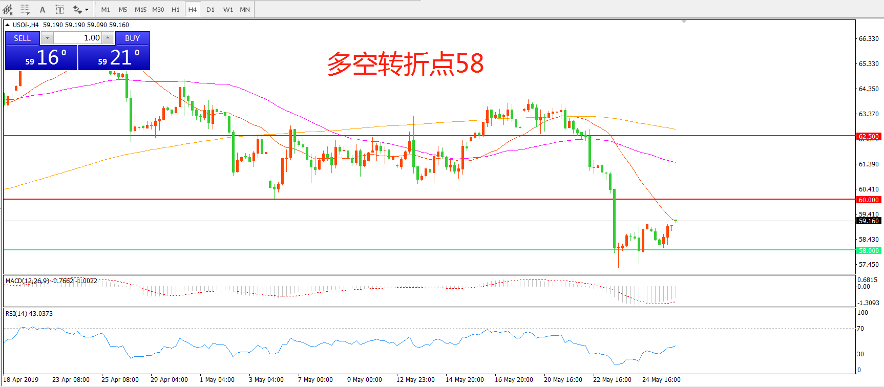 4小时图看,油价大跌后触及58美金获得支撑,反弹走势相对完好, MACD绿柱减少,RSI拐头向上,日内以震荡上行思路为主,重点关注上方60美金附近得失。