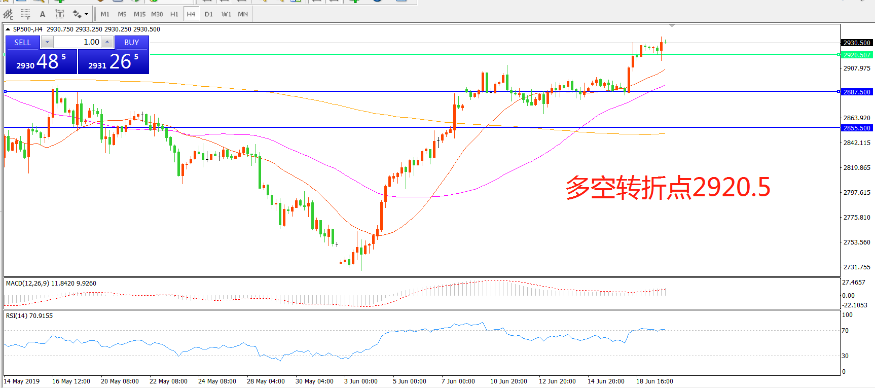 4小时图看,标普高位震荡后上阳拉升,突破前期阻力区间,均线系统逐渐拐头,MACD红柱减少,RSI指标向上,日内延续上行概率较大。