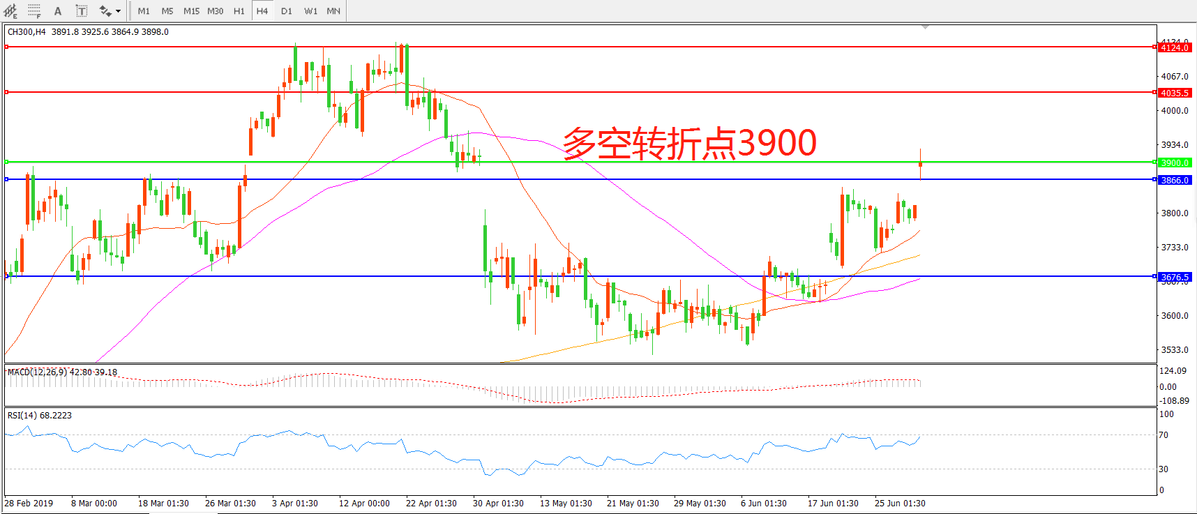 6月28日,沪深300指数以收跌结束上半年收官战。不过,整体来看,上半年A股依然交出不错的成绩单。两市A股市值半年内增加了10.14万亿元。按5月末1.53亿A股账户计算,今年以来人均赚了6.63万元。虽然市场利好消息不断,但短期以震荡形态展开整理跌概率较大,建议关注确定性较高的5G板块,受暑期提振的旅游板块,以及国产替代中受关注程度最高注的芯片板块。在周末大阪G20会议的中美元首会晤中,美方表示不再对中国出口产品加征新的关税,两国经贸团队将就具体问题进行讨论。中美贸易摩擦的缓和有利于缓解市场担忧情绪,利好股市。今日早盘,沪深300跳空高开,报3891.80点,截至发稿收报3898点。