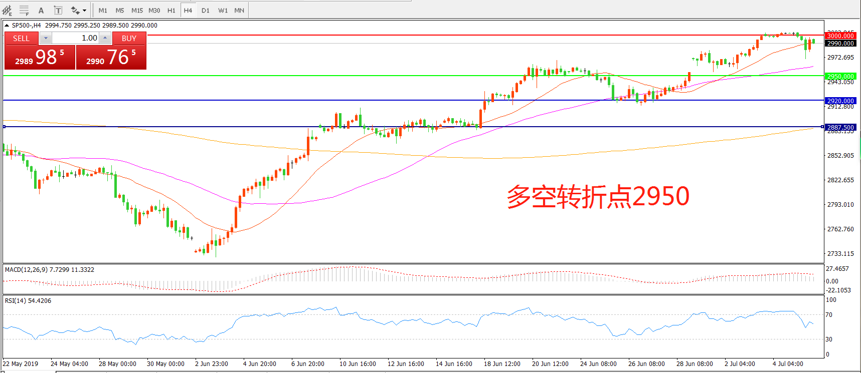 4小时图看,标普站稳2950后震荡上行,反弹动能较强,55周期均线形成为下方支撑,MACD红柱缩短,RSI指标拐头向下,日内延续震荡概率较大。