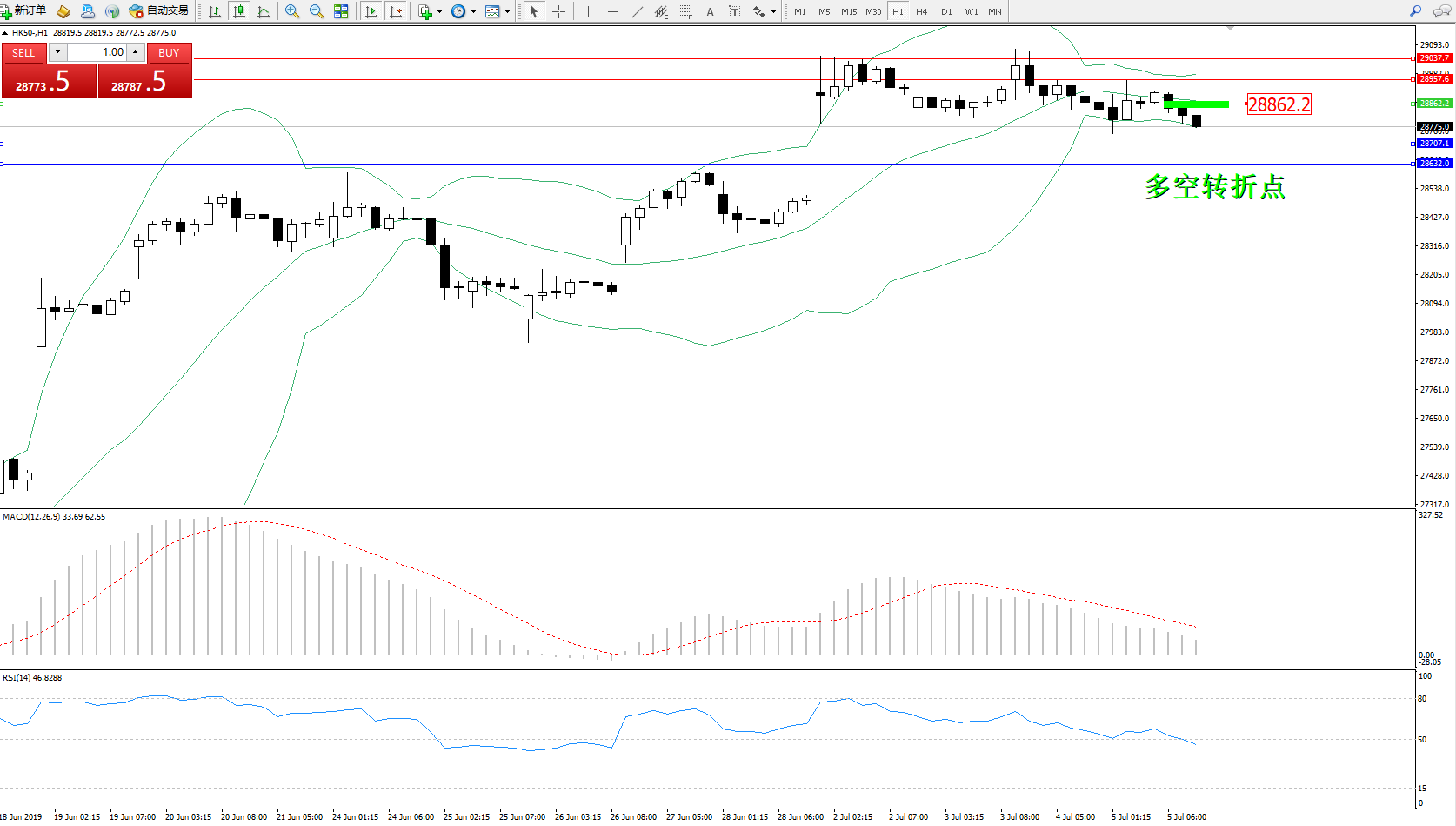 香港恒生指数7月5日(周五)收盘下跌20.94点,跌幅0.07%,报28774.83点;目前全球债市牛市,短期资金涌入新股和债市,大市成交缩量,指数偏软,在29000点水平有阻力,板块也倾向个别发展。恒贸易谈判重启的利好消息已初步被市场消化,投资者亦会观望未来贸易谈判进程。