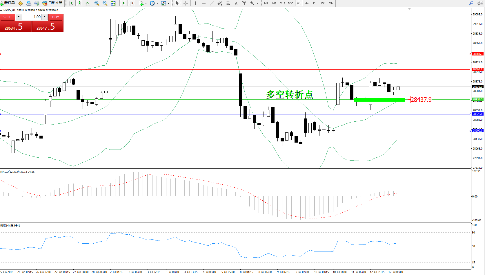 香港恒生指数712日(周五)收盘上涨39.82点,涨幅0.14%,报28471.62点;美股道指、标指创新高,恒指周四受消息刺激恒指低开高走,随后续在高位上横行。市场憧憬减息再度升温,美股再创新高。有多家投资看好中资股前景。做成股市窄幅上落。昨日成交金额减少至675亿元,更未能配合。估计短期内仍会在窄幅区间内波动。