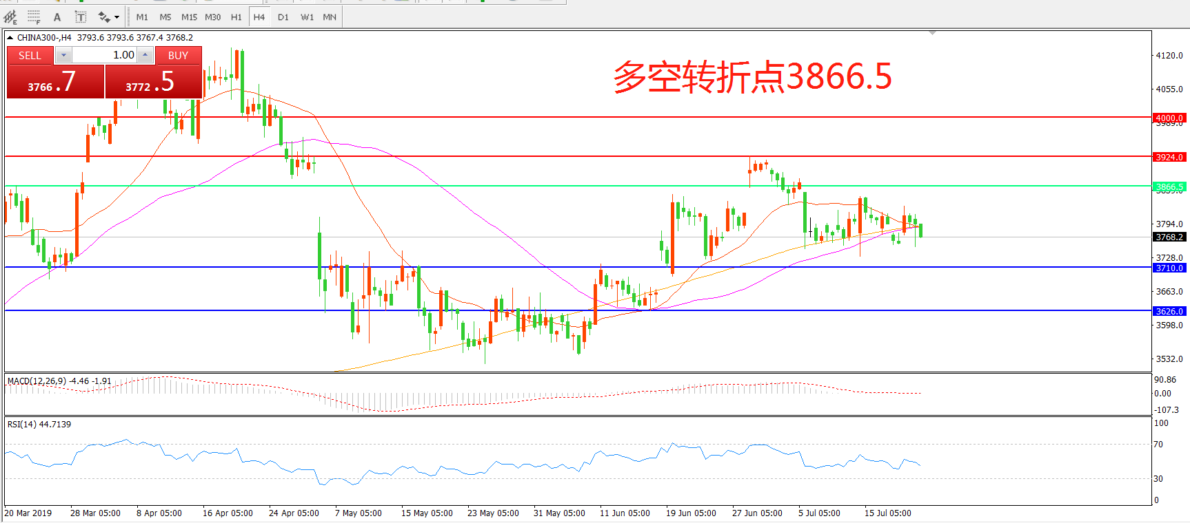 4小时图看,沪深300指数延续震荡下行,均线系统粘合形成上方阻力,MACD红柱缩短,RSI指标走平,日内震荡下行较大。