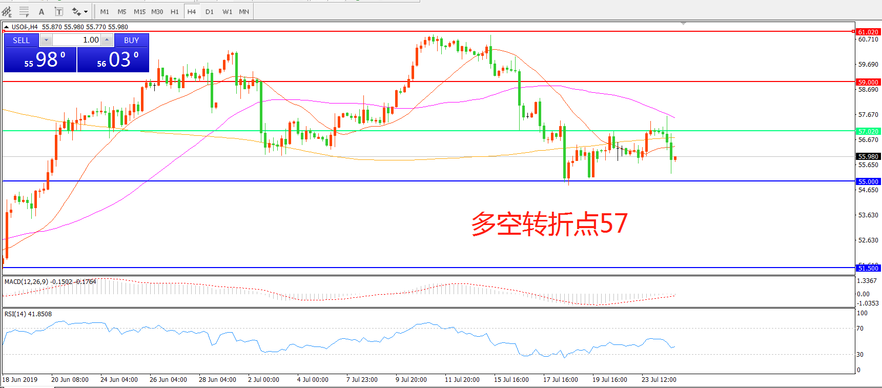 4小时图看,油价经历区间震荡后冲高回落,55周期均线成为上方阻力, MACD绿柱缩短, RSI指标拐头向上,日内延续震荡概率较大。
