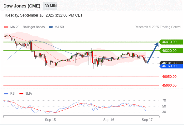 在 46160.00 之上,看涨,目标价位为 46320.00 ,然后为 46410.00 。