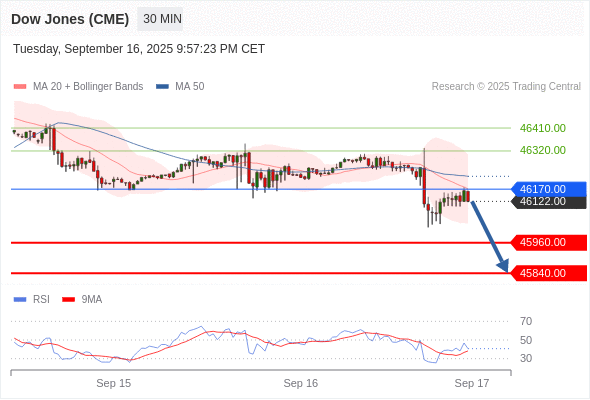 在 46170.00 之下,看跌,目标价位为 45960.00 ,然后为 45840.00 。