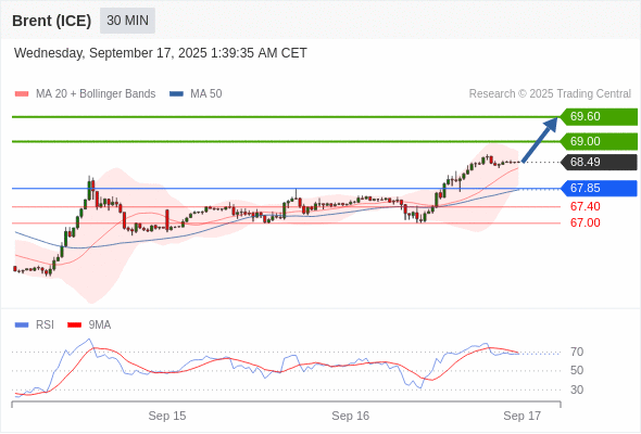 交易策略: 在 67.85 之上,看涨,目标价位为 69.00 ,然后为 69.60 。