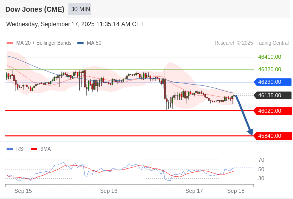 美国道琼斯指数期货 (Z5) 当日内: 短期关键阻力位在46230.00。