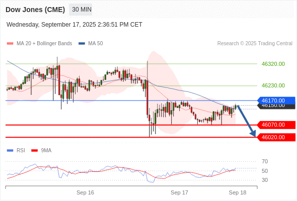美国道琼斯指数期货 (Z5) 当日内: 短期关键阻力位在46170.00。