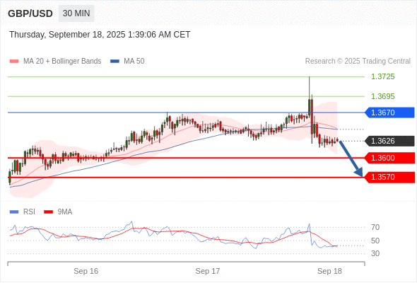 在 1.3670 之下,看跌,目标价位为 1.3600 ,然后为 1.3570 。