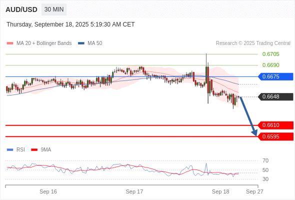 在 0.6675 之下,看跌,目标价位为 0.6610 ,然后为 0.6595 。
