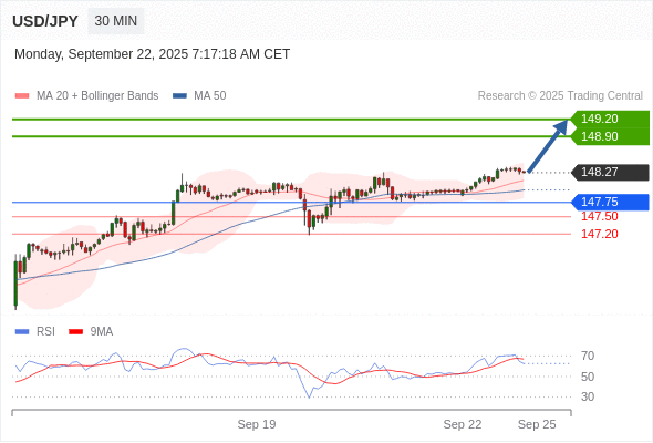 在 147.75 之上,看涨,目标价位为 148.90 ,然后为 149.20 。