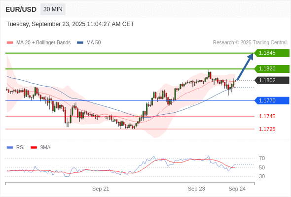 在 1.1770 之上,看涨,目标价位为 1.1820 ,然后为 1.1845 。