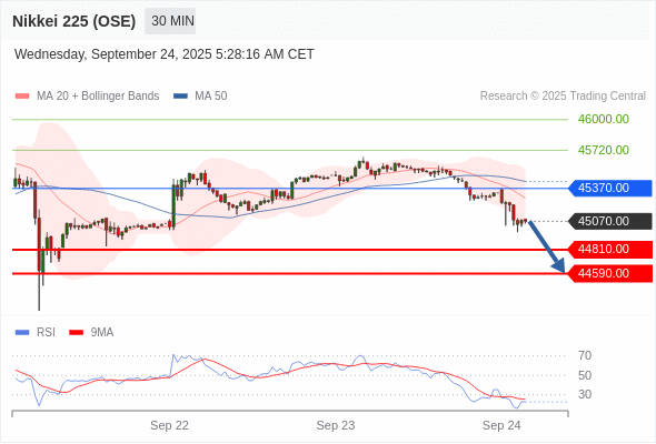 在 45370.00 之下,看跌,目标价位为 44810.00 ,然后为 44590.00 。
