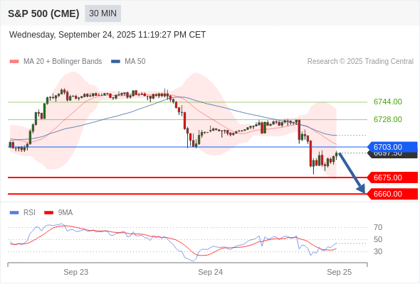 交易策略: 在 6703.00 之下,看跌,目标价位为 6675.00 ,然后为 6660.00 。