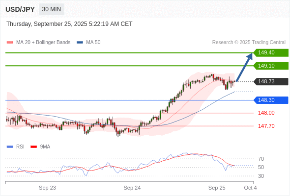 在 148.30 之上,看涨,目标价位为 149.10 ,然后为 149.40 。