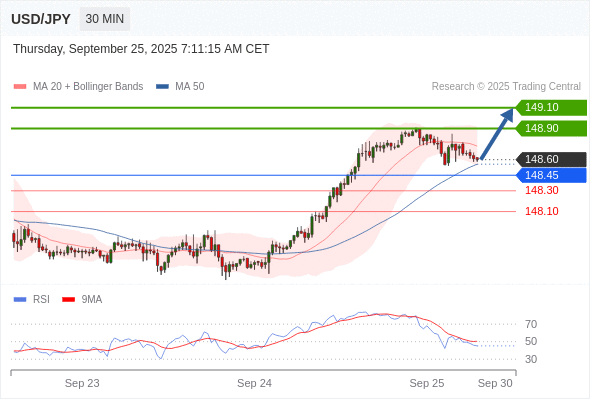 在 148.45 之上,看涨,目标价位为 148.90 ,然后为 149.10 。