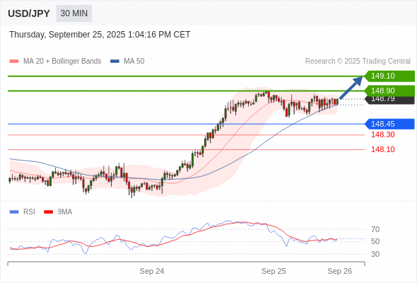 在 148.45 之上,看涨,目标价位为 148.90 ,然后为 149.10 。