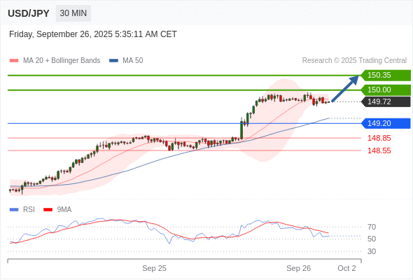 在 149.20 之上,看涨,目标价位为 150.00 ,然后为 150.35 。