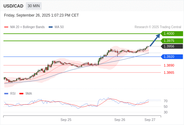 在 1.3920 之上,看涨,目标价位为 1.3975 ,然后为 1.4000 。