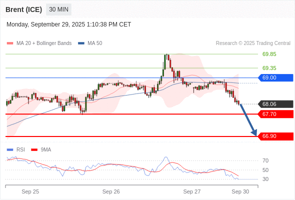 交易策略: 在 69.00 之下,看跌,目标价位为 67.70 ,然后为 66.90 。