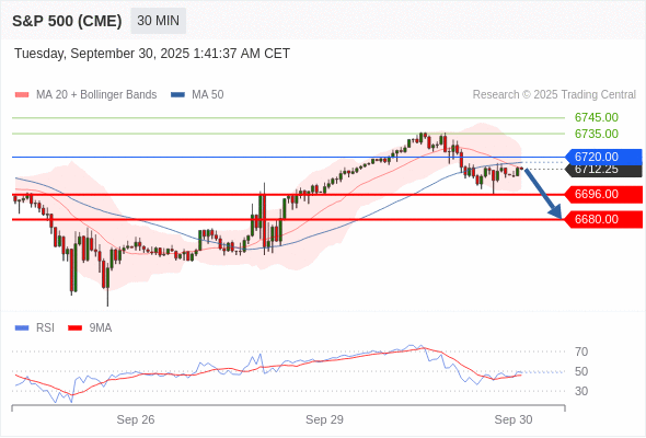 美国标普500指数期货 (Z5) 当日内: 短期关键阻力位在6720.00。