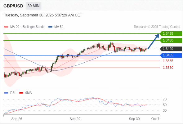 在 1.3405 之上,看涨,目标价位为 1.3460 ,然后为 1.3485 。