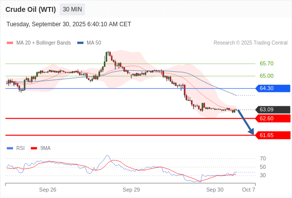在 64.30 之下,看跌,目标价位为 62.60 ,然后为 61.65 。