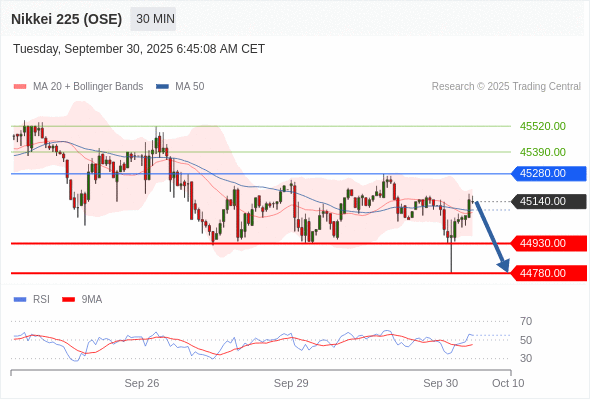 在 45280.00 之下,看跌,目标价位为 44930.00 ,然后为 44780.00 。