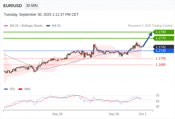 欧元/美元 当日内: 在1.1730之上,看涨。