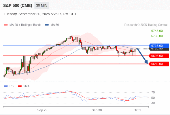 美国标普500指数期货 (Z5) 当日内: 短期关键阻力位在6716.00。