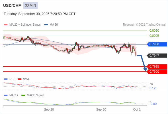 美元/瑞郎 当日内 : 看跌,在 0.7980 之下。