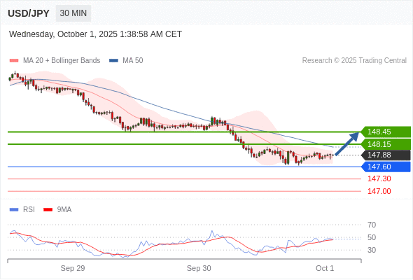 在 147.60 之上,看涨,目标价位为 148.15 ,然后为 148.45 。