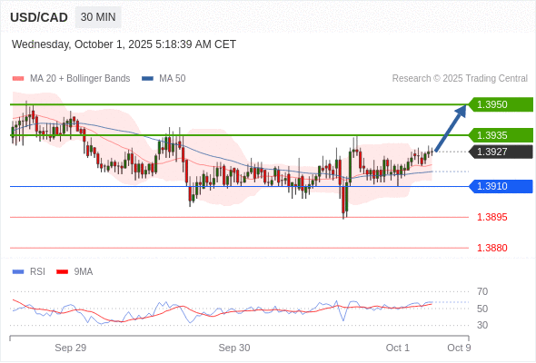 在 1.3910 之上,看涨,目标价位为 1.3935 ,然后为 1.3950 。