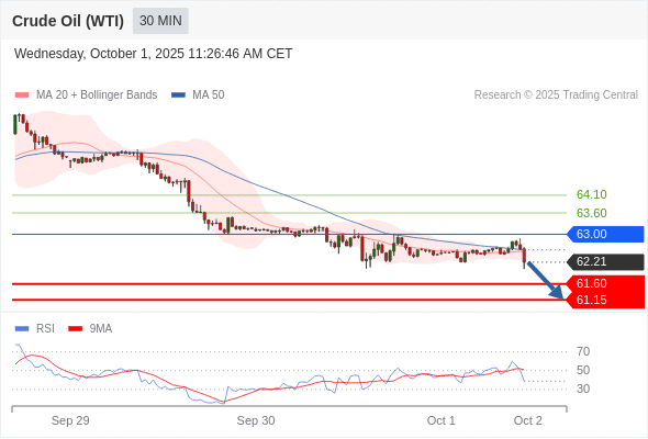 美国原油 (WTI) 期货 (X5) 当日内: 短期关键阻力位在63.00。