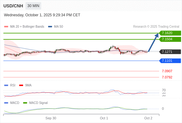备选策略: 如跌破 7.1101 ,USD/CNH 目标方向定在 7.0907 和 7.0792 。