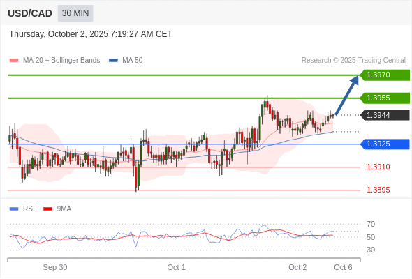 在 1.3925 之上,看涨,目标价位为 1.3955 ,然后为 1.3970 。