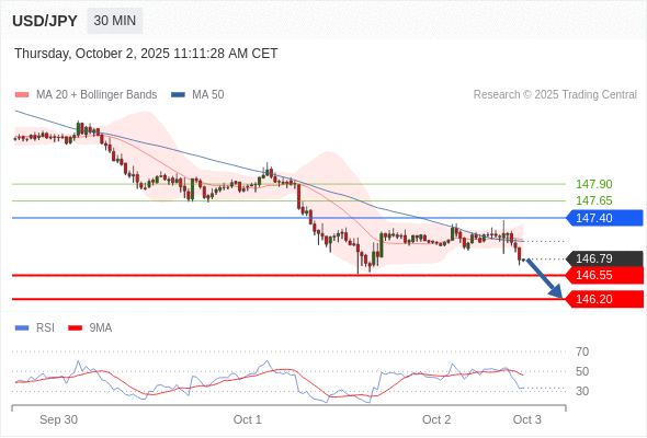 在 147.40 之下,看跌,目标价位为 146.55 ,然后为 146.20 。