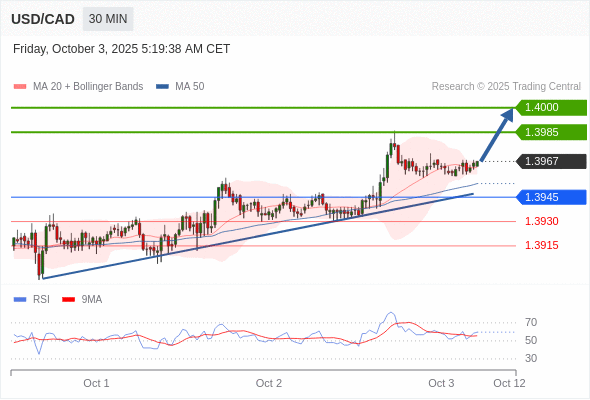 在 1.3945 之上,看涨,目标价位为 1.3985 ,然后为 1.4000 。