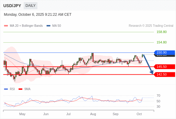 在 150.90 之下,看跌,目标价位为 145.50 ,然后为 142.50 。