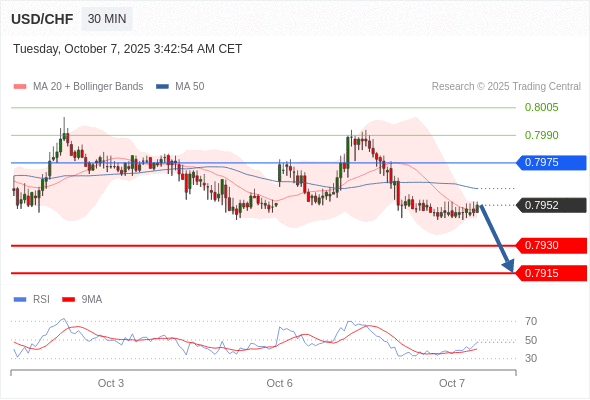 在 0.7975 之下,看跌,目标价位为 0.7930 ,然后为 0.7915 。