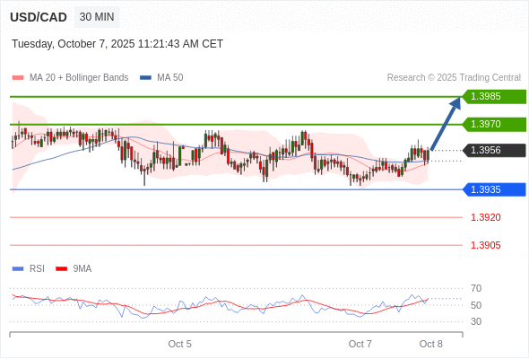 在 1.3935 之上,看涨,目标价位为 1.3970 ,然后为 1.3985 。
