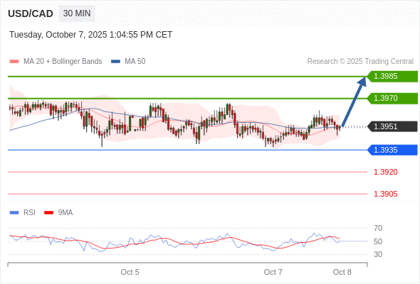 在 1.3935 之上,看涨,目标价位为 1.3970 ,然后为 1.3985 。
